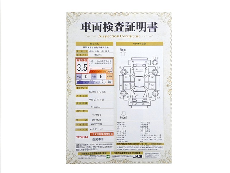 詳細及び現状の車両状態につきましては、店舗スタッフまでお尋ねください。 - 注2)上記と同様の評価点・状態表を「車両検査証明書」として店舗の展示車両に搭載しております。