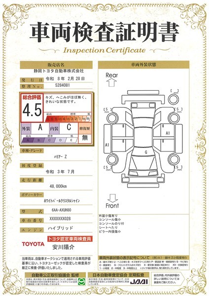 詳細及び現状の車両状態につきましては、店舗スタッフまでお尋ねください。 - 注2)上記と同様の評価点・状態表を「車両検査証明書」として店舗の展示車両に搭載しております。
