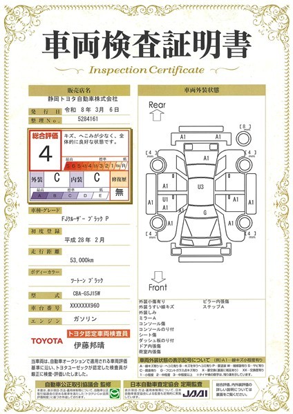 - 表示項目・方法・運用体制等について、自動車公正取引協議会の定める基準を満たした「トヨタU-Car品質評価制度」に基づき作成しております。