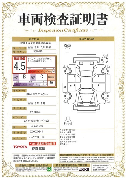 詳細及び現状の車両状態につきましては、店舗スタッフまでお尋ねください。 - 注2)上記と同様の評価点・状態表を「車両検査証明書」として店舗の展示車両に搭載しております。