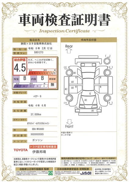 詳細及び現状の車両状態につきましては、店舗スタッフまでお尋ねください。 - 注2)上記と同様の評価点・状態表を「車両検査証明書」として店舗の展示車両に搭載しております。