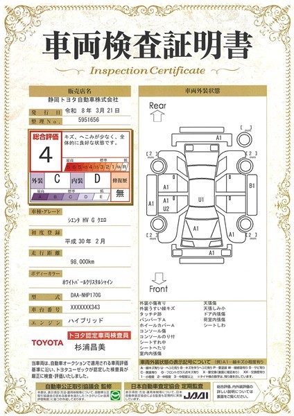 詳細及び現状の車両状態につきましては、店舗スタッフまでお尋ねください。 - 注2)上記と同様の評価点・状態表を「車両検査証明書」として店舗の展示車両に搭載しております。