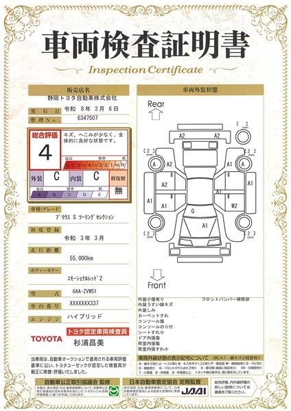 詳細及び現状の車両状態につきましては、店舗スタッフまでお尋ねください。 - 注2)上記と同様の評価点・状態表を「車両検査証明書」として店舗の展示車両に搭載しております。