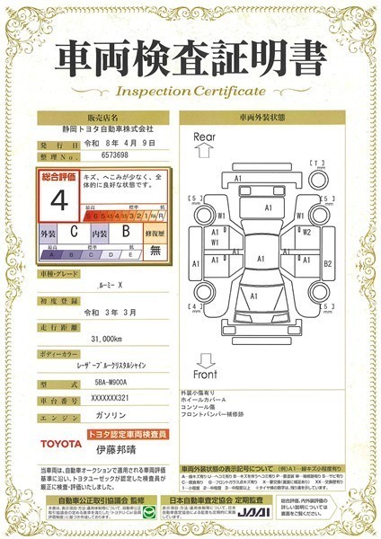 詳細及び現状の車両状態につきましては、店舗スタッフまでお尋ねください。 - 注2)上記と同様の評価点・状態表を「車両検査証明書」として店舗の展示車両に搭載しております。