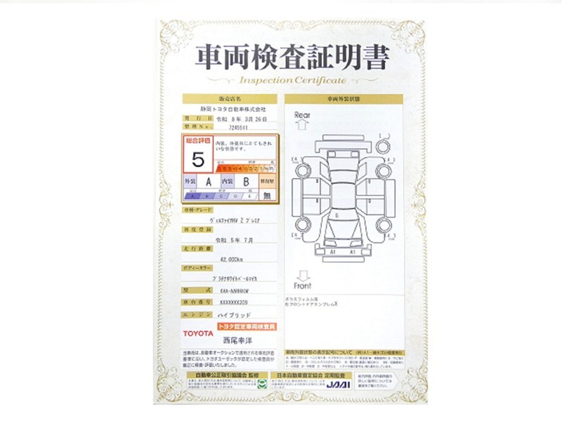 詳細及び現状の車両状態につきましては、店舗スタッフまでお尋ねください。 - 注2)上記と同様の評価点・状態表を「車両検査証明書」として店舗の展示車両に搭載しております。