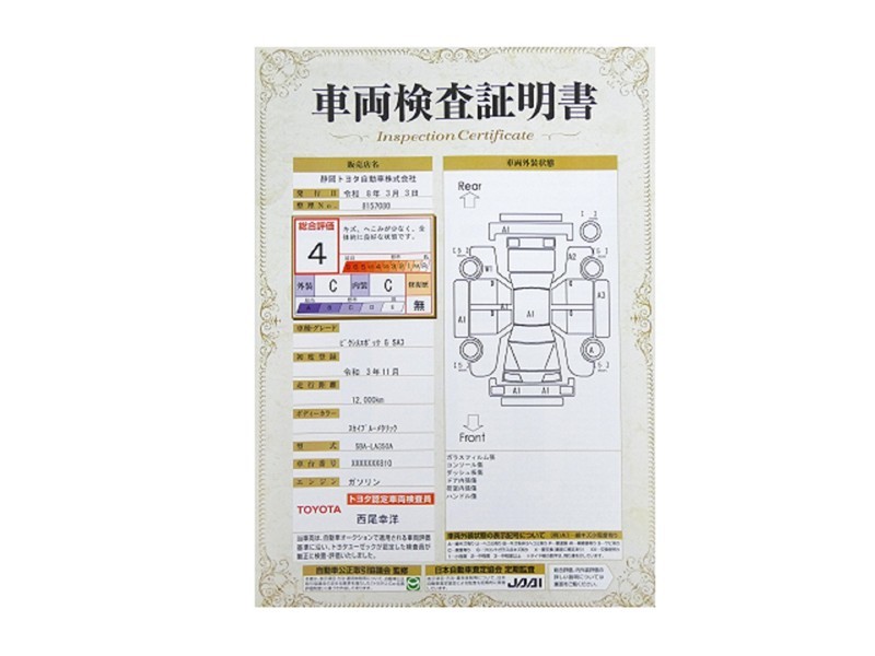 詳細及び現状の車両状態につきましては、店舗スタッフまでお尋ねください。 - 注2)上記と同様の評価点・状態表を「車両検査証明書」として店舗の展示車両に搭載しております。