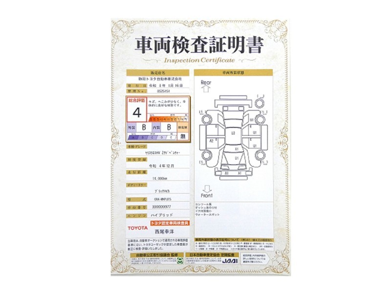 詳細及び現状の車両状態につきましては、店舗スタッフまでお尋ねください。 - 注2)上記と同様の評価点・状態表を「車両検査証明書」として店舗の展示車両に搭載しております。