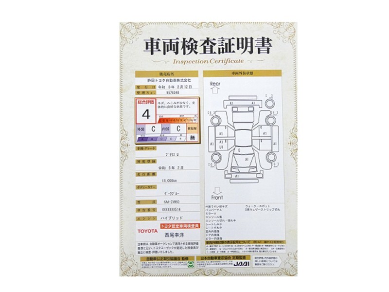 詳細及び現状の車両状態につきましては、店舗スタッフまでお尋ねください。 - 注2)上記と同様の評価点・状態表を「車両検査証明書」として店舗の展示車両に搭載しております。