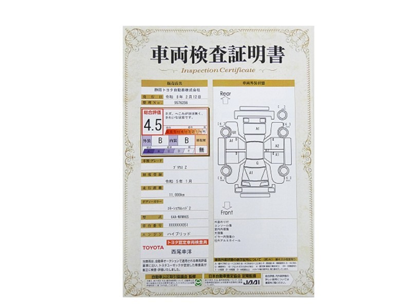 詳細及び現状の車両状態につきましては、店舗スタッフまでお尋ねください。 - 注2)上記と同様の評価点・状態表を「車両検査証明書」として店舗の展示車両に搭載しております。