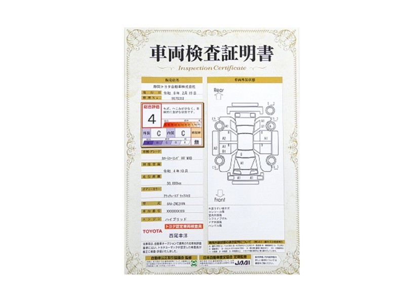 詳細及び現状の車両状態につきましては、店舗スタッフまでお尋ねください。 - 注2)上記と同様の評価点・状態表を「車両検査証明書」として店舗の展示車両に搭載しております。