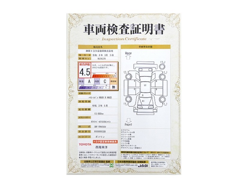 詳細及び現状の車両状態につきましては、店舗スタッフまでお尋ねください。 - 注2)上記と同様の評価点・状態表を「車両検査証明書」として店舗の展示車両に搭載しております。