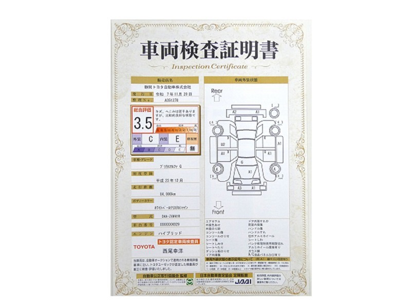 詳細及び現状の車両状態につきましては、店舗スタッフまでお尋ねください。 - 注2)上記と同様の評価点・状態表を「車両検査証明書」として店舗の展示車両に搭載しております。