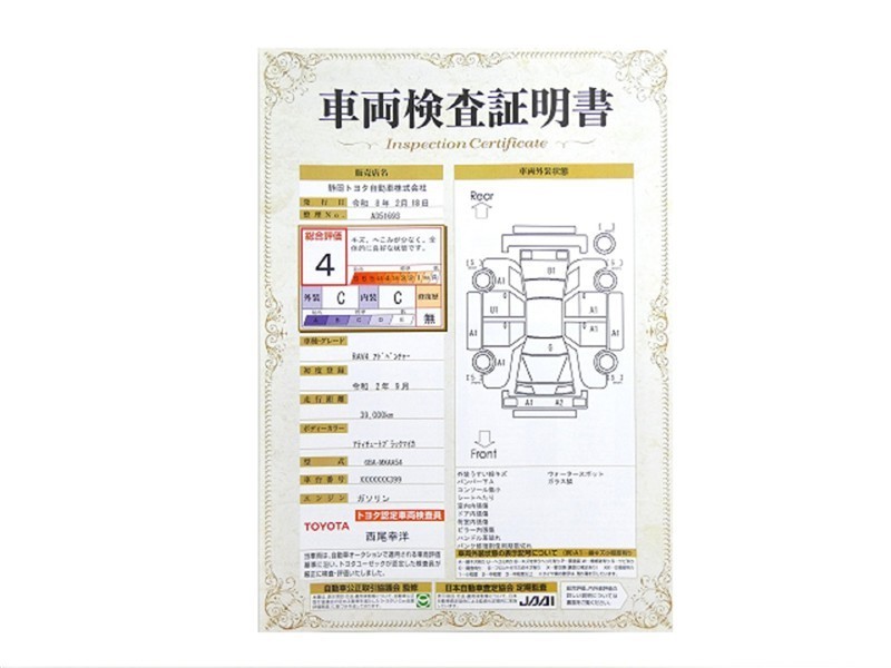 詳細及び現状の車両状態につきましては、店舗スタッフまでお尋ねください。 - 注2)上記と同様の評価点・状態表を「車両検査証明書」として店舗の展示車両に搭載しております。