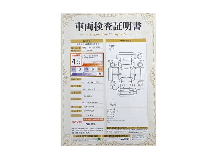 詳細及び現状の車両状態につきましては、店舗スタッフまでお尋ねください。 - 注2)上記と同様の評価点・状態表を「車両検査証明書」として店舗の展示車両に搭載しております。