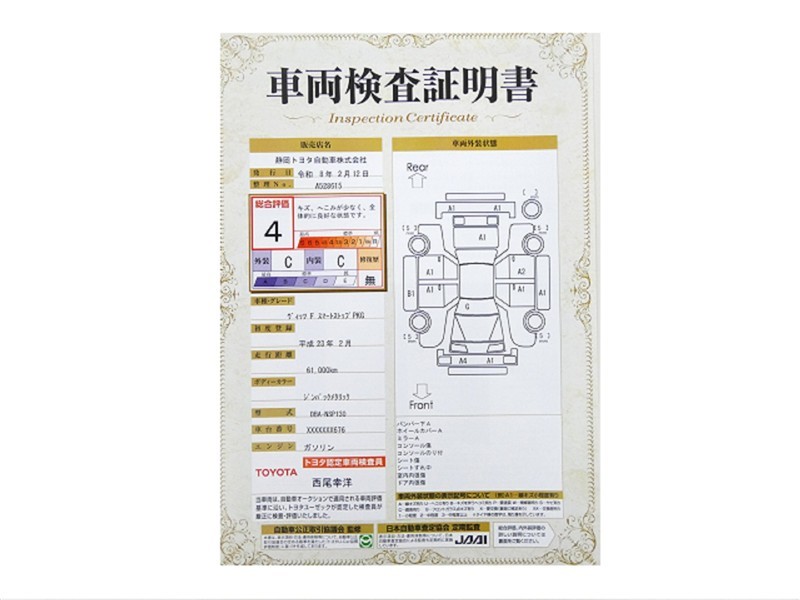 詳細及び現状の車両状態につきましては、店舗スタッフまでお尋ねください。 - 注2)上記と同様の評価点・状態表を「車両検査証明書」として店舗の展示車両に搭載しております。