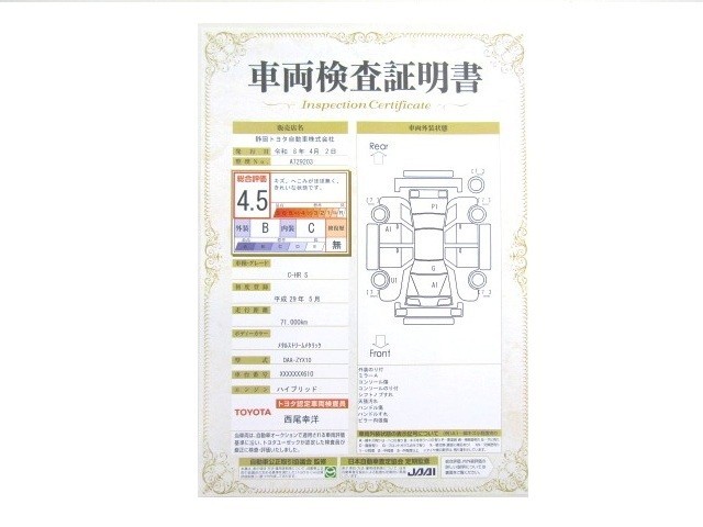 詳細及び現状の車両状態につきましては、店舗スタッフまでお尋ねください。 - 注2)上記と同様の評価点・状態表を「車両検査証明書」として店舗の展示車両に搭載しております。