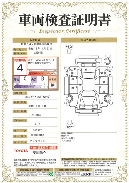 詳細及び現状の車両状態につきましては、店舗スタッフまでお尋ねください。 - 注2)上記と同様の評価点・状態表を「車両検査証明書」として店舗の展示車両に搭載しております。