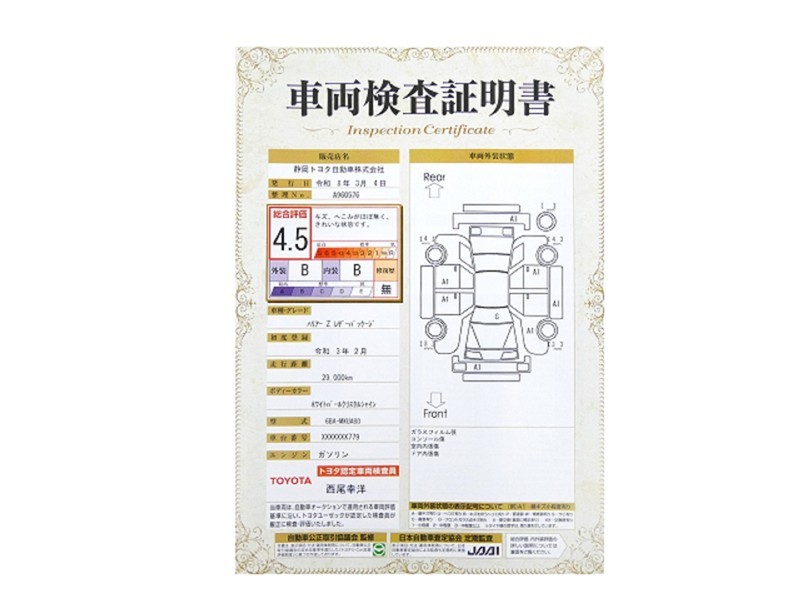 詳細及び現状の車両状態につきましては、店舗スタッフまでお尋ねください。 - 注2)上記と同様の評価点・状態表を「車両検査証明書」として店舗の展示車両に搭載しております。