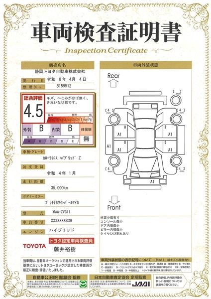 詳細及び現状の車両状態につきましては、店舗スタッフまでお尋ねください。 - 注2)上記と同様の評価点・状態表を「車両検査証明書」として店舗の展示車両に搭載しております。