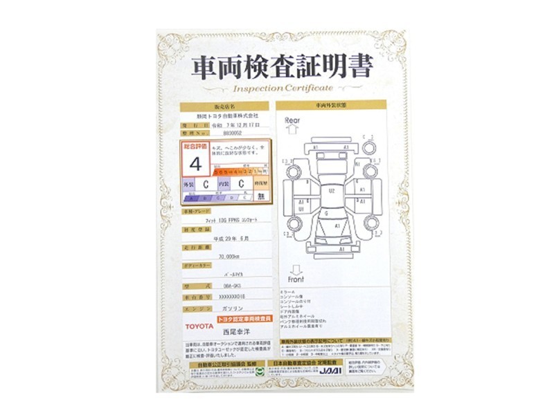 詳細及び現状の車両状態につきましては、店舗スタッフまでお尋ねください。 - 注2)上記と同様の評価点・状態表を「車両検査証明書」として店舗の展示車両に搭載しております。