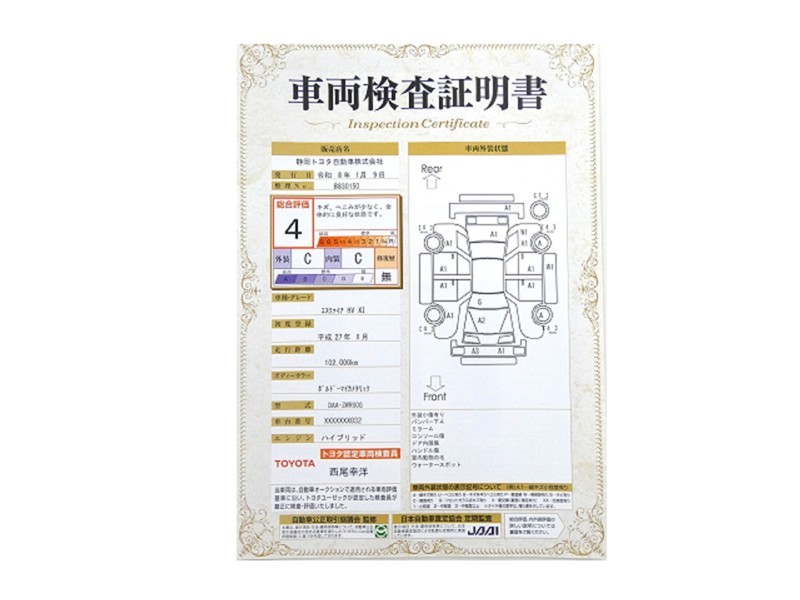 詳細及び現状の車両状態につきましては、店舗スタッフまでお尋ねください。 - 注2)上記と同様の評価点・状態表を「車両検査証明書」として店舗の展示車両に搭載しております。