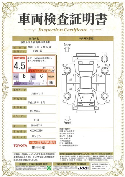 詳細及び現状の車両状態につきましては、店舗スタッフまでお尋ねください。 - 注2)上記と同様の評価点・状態表を「車両検査証明書」として店舗の展示車両に搭載しております。