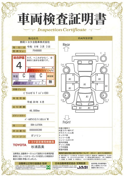 詳細及び現状の車両状態につきましては、店舗スタッフまでお尋ねください。 - 注2)上記と同様の評価点・状態表を「車両検査証明書」として店舗の展示車両に搭載しております。