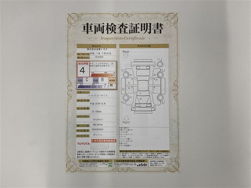 詳細及び現状の車両状態につきましては、店舗スタッフまでお尋ねください。 - 注2)上記と同様の評価点・状態表を「車両検査証明書」として店舗の展示車両に搭載しております。