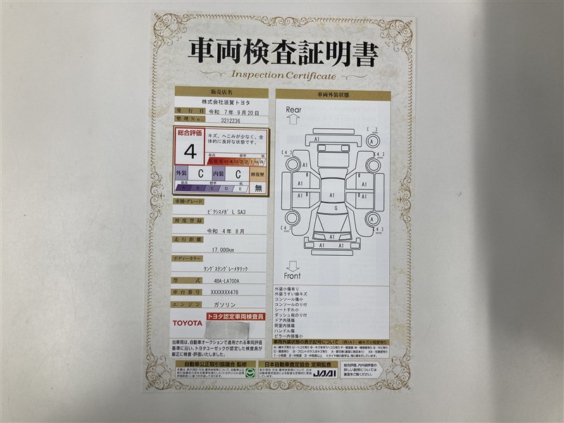 詳細及び現状の車両状態につきましては、店舗スタッフまでお尋ねください。 - 注2)上記と同様の評価点・状態表を「車両検査証明書」として店舗の展示車両に搭載しております。
