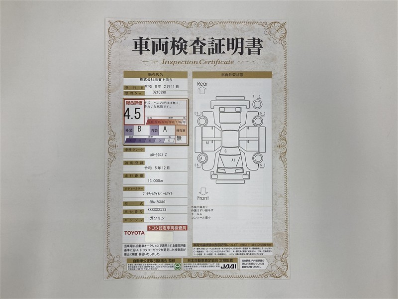 - 表示項目・方法・運用体制等について、自動車公正取引協議会の定める基準を満たした「トヨタU-Car品質評価制度」に基づき作成しております。