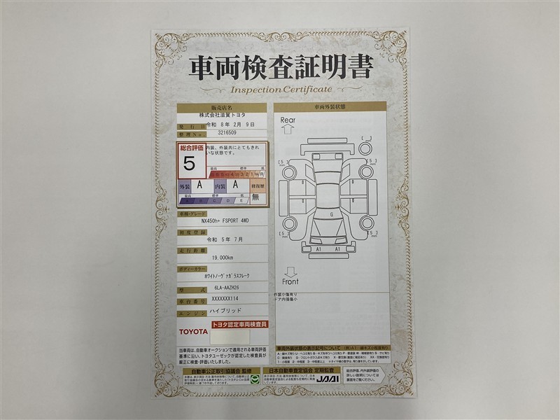 詳細及び現状の車両状態につきましては、店舗スタッフまでお尋ねください。 - 注2)上記と同様の評価点・状態表を「車両検査証明書」として店舗の展示車両に搭載しております。