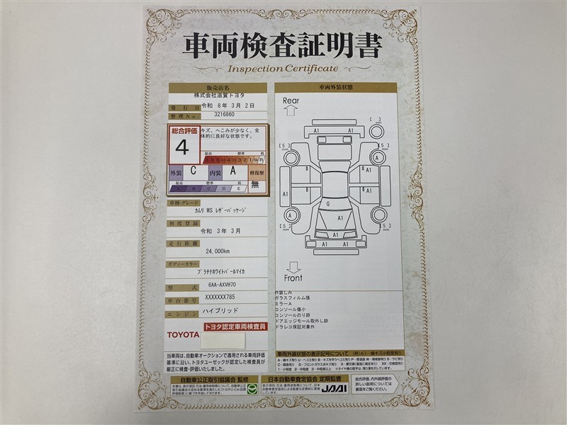詳細及び現状の車両状態につきましては、店舗スタッフまでお尋ねください。 - 注2)上記と同様の評価点・状態表を「車両検査証明書」として店舗の展示車両に搭載しております。