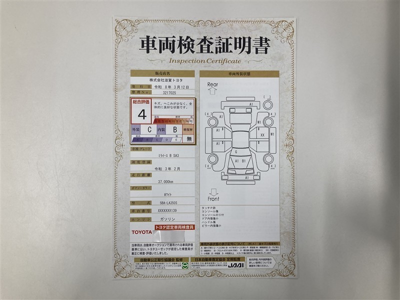 詳細及び現状の車両状態につきましては、店舗スタッフまでお尋ねください。 - 注2)上記と同様の評価点・状態表を「車両検査証明書」として店舗の展示車両に搭載しております。