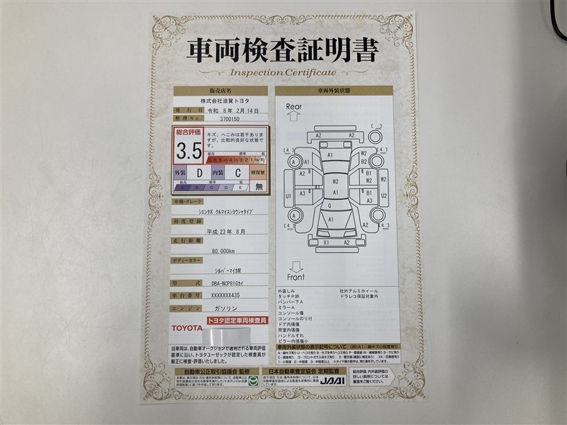 詳細及び現状の車両状態につきましては、店舗スタッフまでお尋ねください。 - 注2)上記と同様の評価点・状態表を「車両検査証明書」として店舗の展示車両に搭載しております。