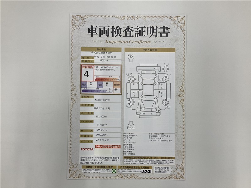 詳細及び現状の車両状態につきましては、店舗スタッフまでお尋ねください。 - 注2)上記と同様の評価点・状態表を「車両検査証明書」として店舗の展示車両に搭載しております。