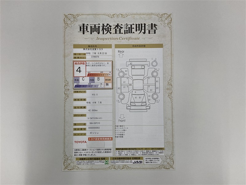- 表示項目・方法・運用体制等について、自動車公正取引協議会の定める基準を満たした「トヨタU-Car品質評価制度」に基づき作成しております。