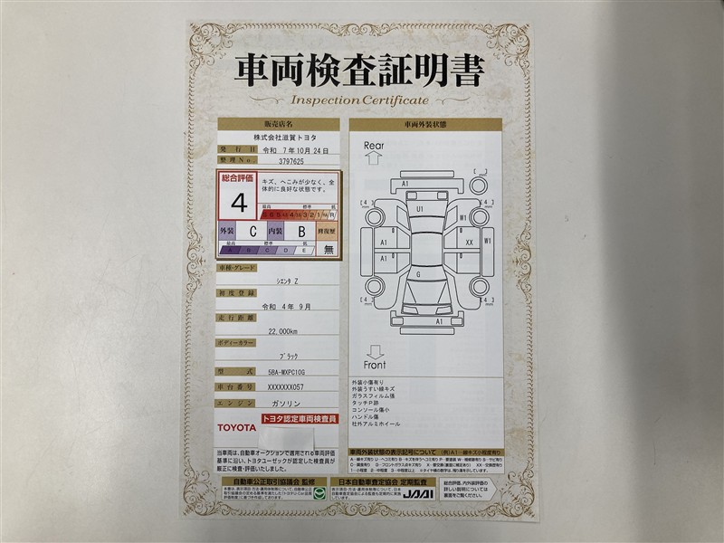 詳細及び現状の車両状態につきましては、店舗スタッフまでお尋ねください。 - 注2)上記と同様の評価点・状態表を「車両検査証明書」として店舗の展示車両に搭載しております。