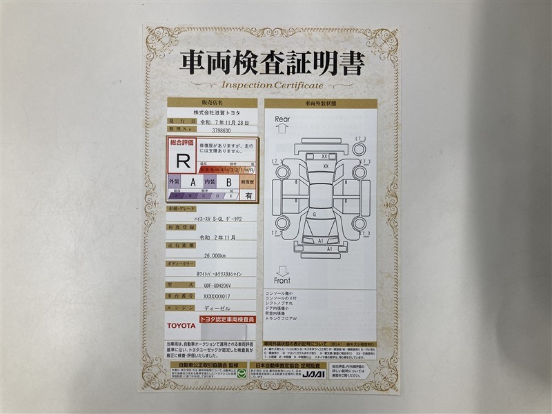 詳細及び現状の車両状態につきましては、店舗スタッフまでお尋ねください。 - 注2)上記と同様の評価点・状態表を「車両検査証明書」として店舗の展示車両に搭載しております。