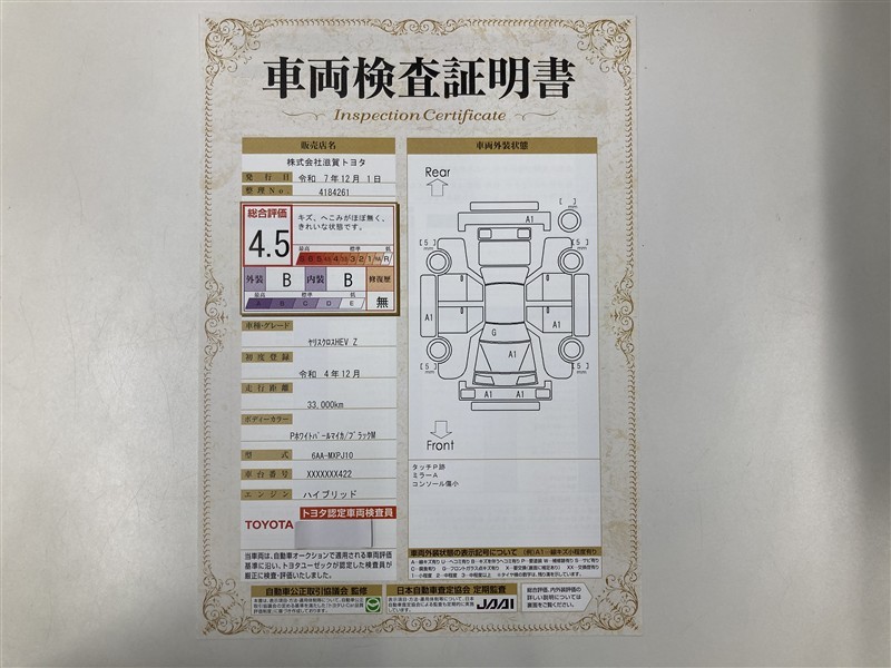 詳細及び現状の車両状態につきましては、店舗スタッフまでお尋ねください。 - 注2)上記と同様の評価点・状態表を「車両検査証明書」として店舗の展示車両に搭載しております。