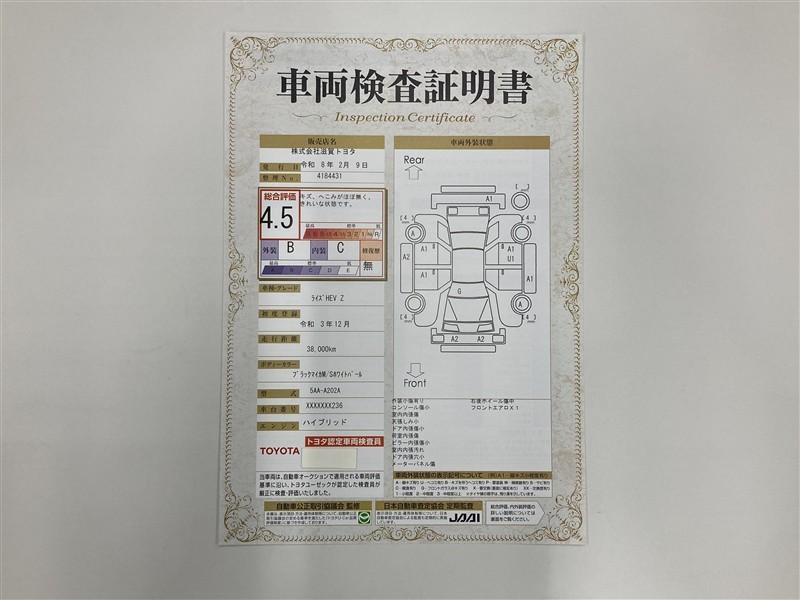 詳細及び現状の車両状態につきましては、店舗スタッフまでお尋ねください。 - 注2)上記と同様の評価点・状態表を「車両検査証明書」として店舗の展示車両に搭載しております。