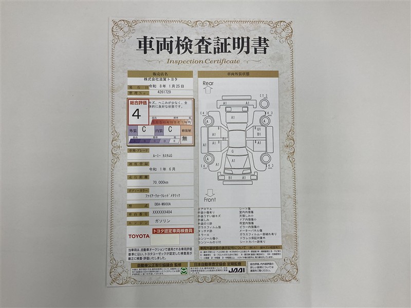 詳細及び現状の車両状態につきましては、店舗スタッフまでお尋ねください。 - 注2)上記と同様の評価点・状態表を「車両検査証明書」として店舗の展示車両に搭載しております。