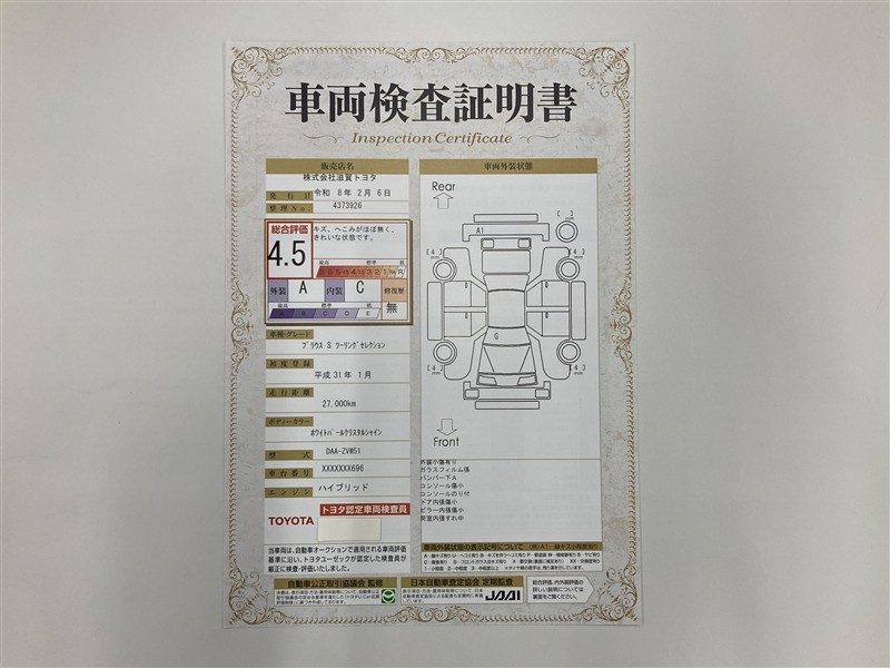 - 表示項目・方法・運用体制等について、自動車公正取引協議会の定める基準を満たした「トヨタU-Car品質評価制度」に基づき作成しております。