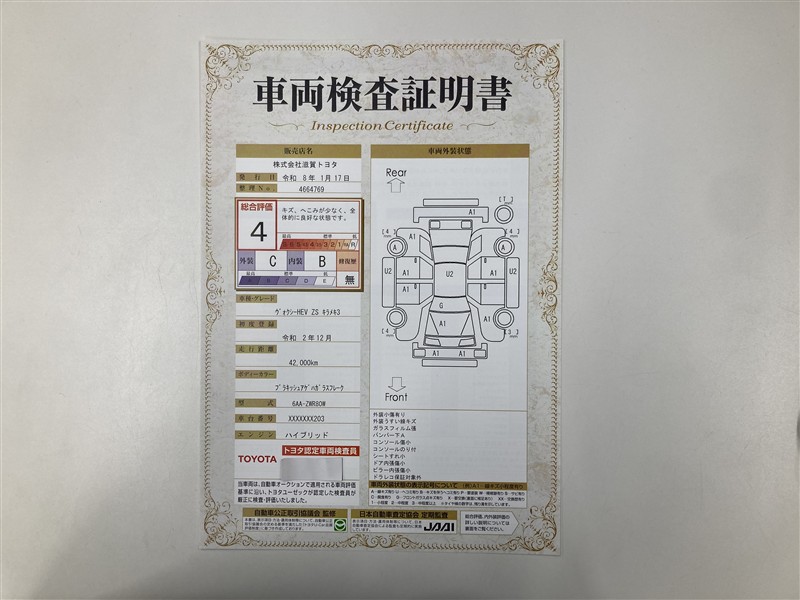 詳細及び現状の車両状態につきましては、店舗スタッフまでお尋ねください。 - 注2)上記と同様の評価点・状態表を「車両検査証明書」として店舗の展示車両に搭載しております。