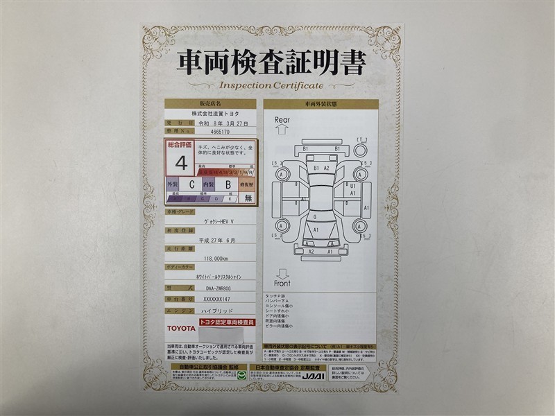 詳細及び現状の車両状態につきましては、店舗スタッフまでお尋ねください。 - 注2)上記と同様の評価点・状態表を「車両検査証明書」として店舗の展示車両に搭載しております。