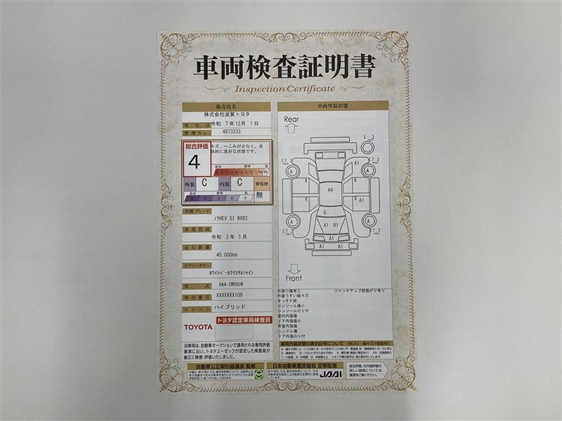 詳細及び現状の車両状態につきましては、店舗スタッフまでお尋ねください。 - 注2)上記と同様の評価点・状態表を「車両検査証明書」として店舗の展示車両に搭載しております。