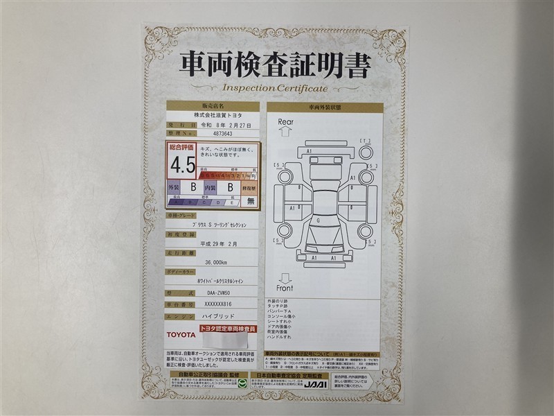 詳細及び現状の車両状態につきましては、店舗スタッフまでお尋ねください。 - 注2)上記と同様の評価点・状態表を「車両検査証明書」として店舗の展示車両に搭載しております。