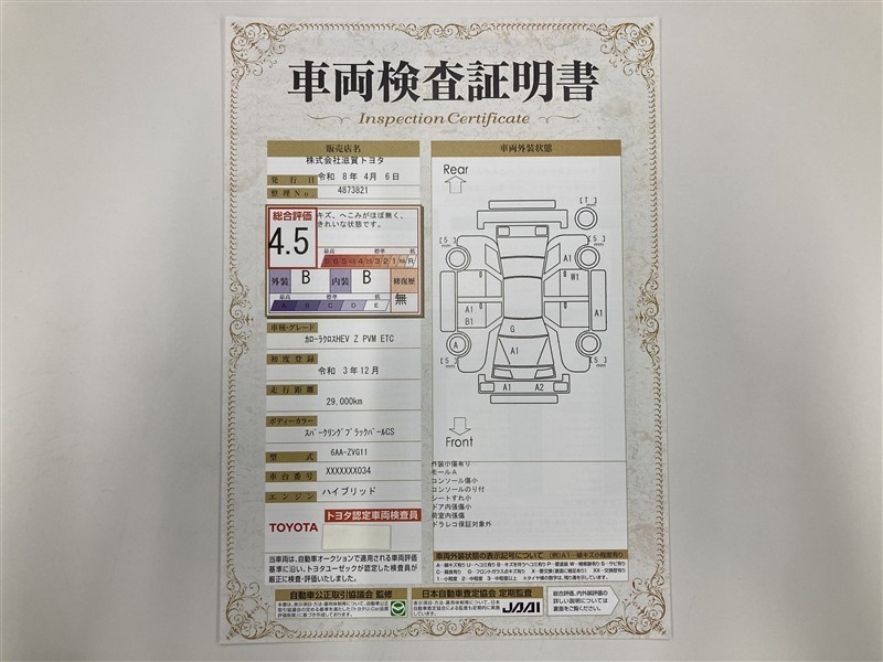 詳細及び現状の車両状態につきましては、店舗スタッフまでお尋ねください。 - 注2)上記と同様の評価点・状態表を「車両検査証明書」として店舗の展示車両に搭載しております。