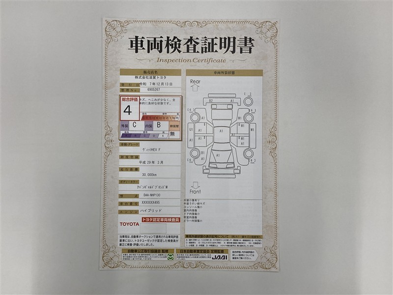 詳細及び現状の車両状態につきましては、店舗スタッフまでお尋ねください。 - 注2)上記と同様の評価点・状態表を「車両検査証明書」として店舗の展示車両に搭載しております。