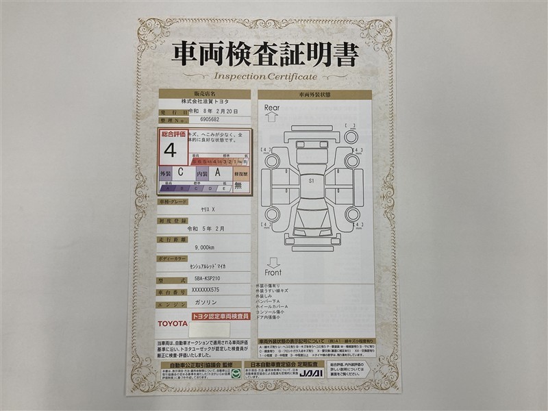 詳細及び現状の車両状態につきましては、店舗スタッフまでお尋ねください。 - 注2)上記と同様の評価点・状態表を「車両検査証明書」として店舗の展示車両に搭載しております。