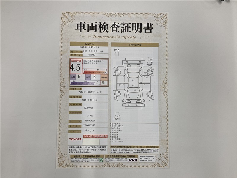 詳細及び現状の車両状態につきましては、店舗スタッフまでお尋ねください。 - 注2)上記と同様の評価点・状態表を「車両検査証明書」として店舗の展示車両に搭載しております。